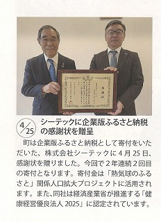 2025/4/25 上士幌町長 竹中貢様が来社され企業版ふるさと納税の感謝状を頂戴しました。